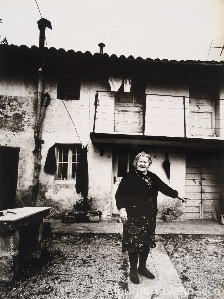 Donna anziana in posa nel cortile di casa sua, ad Adegliacco.