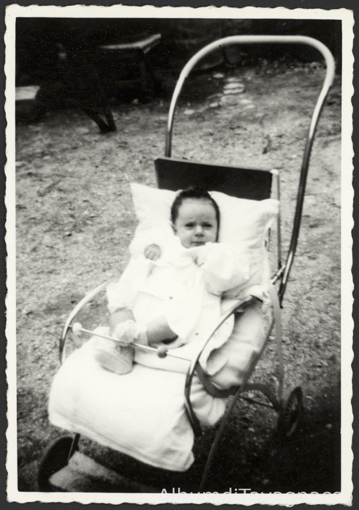 Ritratto della neonata Tiziana Noacco, all'età apparente di 3/4 mesi ca., seduta nel passeggino.