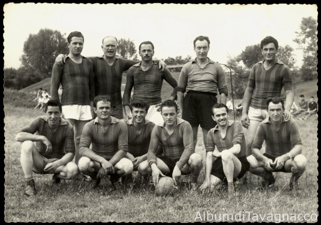 La squadra di calcio degli ammogliati di Adegliacco, Cavalicco e Santa Fosca, in posa sui prati del Cormor, in occasione della sfida con la squadra dei celibi.