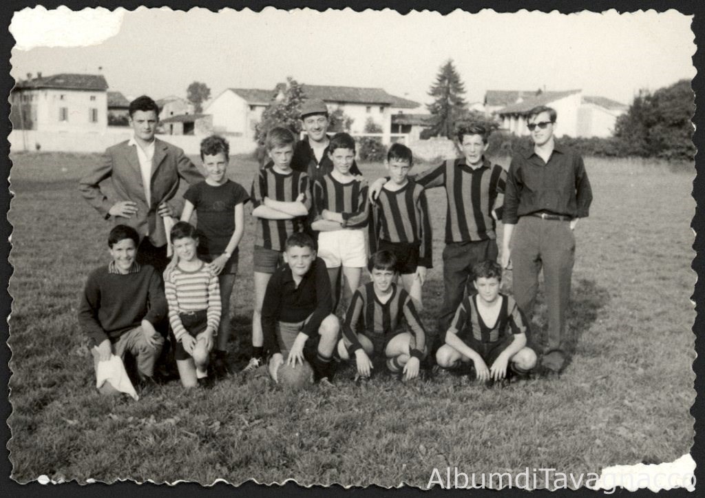 La squadra dei "Garibaldini", partecipante al campionato aspirantistico di calcio della GIAC, in posa sul campo sportivo di Villa Tinin, insieme ai dirigenti Marco Mansutti, Flavio Comuzzo e Giampaolo Feruglio.