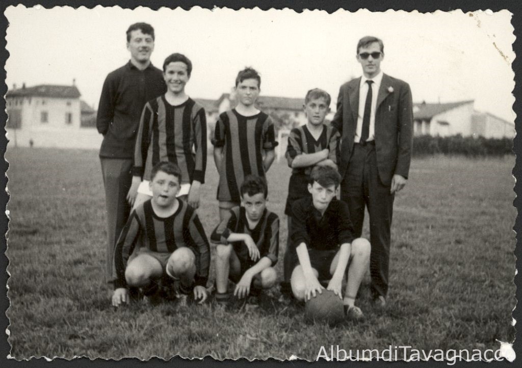 La squadra dei "Rocciatori", partecipante al campionato aspirantistico di calcio della GIAC, in posa sul campo sportivo di Villa Tinin, insieme ai dirigenti Flavio Comuzzo e Giampaolo Feruglio.