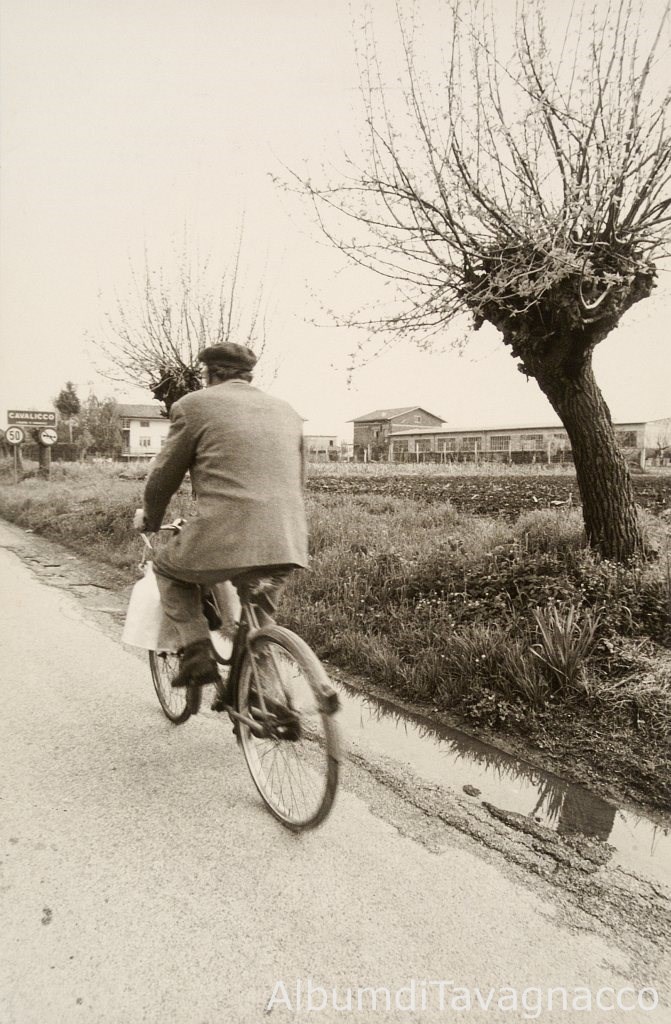 Uomo (detto “Negus”) che percorre Via Molin Nuovo in bicicletta, per portare il latte munto, alla latteria di Cavalicco.
