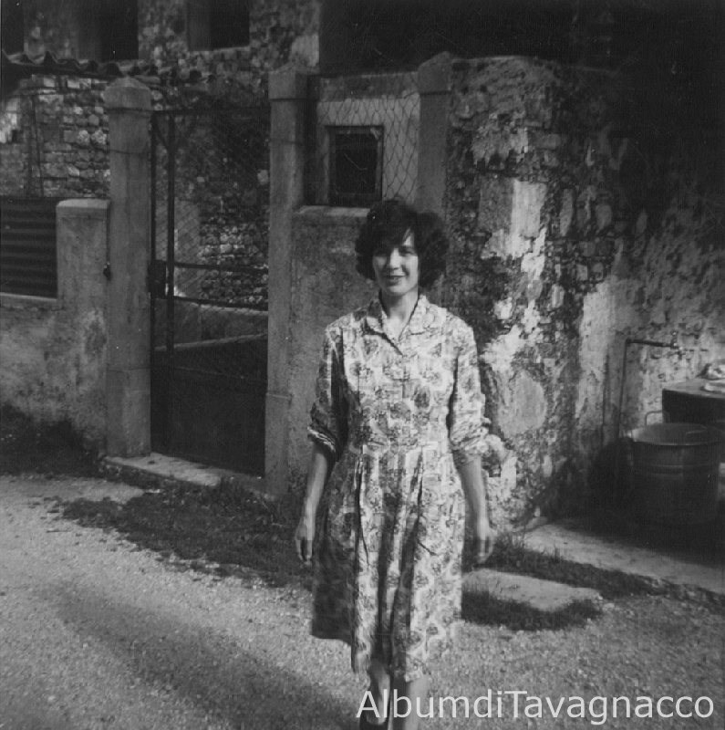 Ritratto di Laura Contardo con una fontana alle spalle, in una pausa del lavaggio dei panni.
