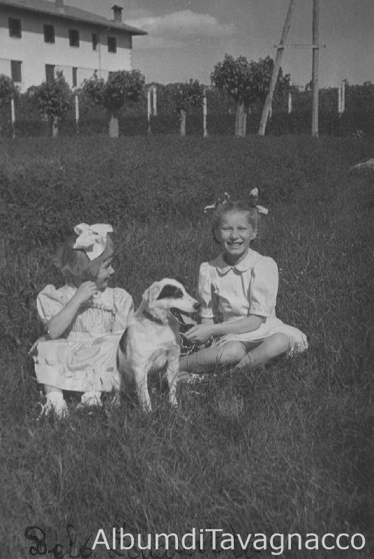 Le sorelle Fernanda e Giordana Zenarolla, in posa insieme a un cane, in un prato nei pressi di Via Florio.