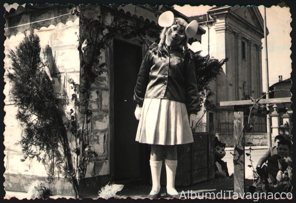 Il bambino Loris Querini, mascherato da Minnie, in posa sul carro allegorico, in Piazza Libertà.
