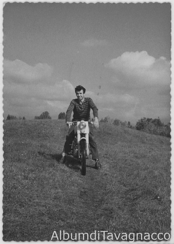 Luigi Piccini in sella al suo "Rumi" (motocicletta), in posa in un prato nei pressi del roccolo.