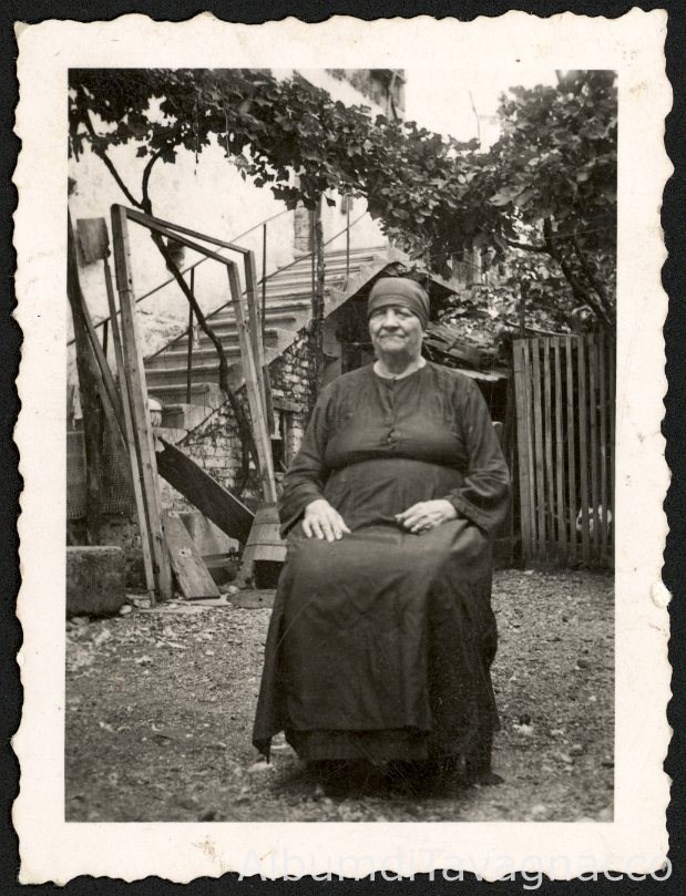 Ritratto di Luigia Di Giorgio in posa, seduta nel cortile di casa Noacco (Via Dei Martiri).