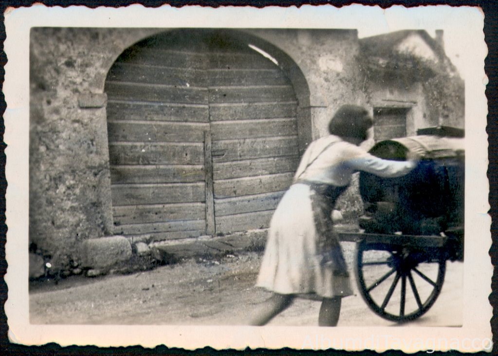 Istantanea con Maria Galvan, ex mezzadro delle terre di proprietà della fam. Bertoli, mentre spinge il carro con la botte.