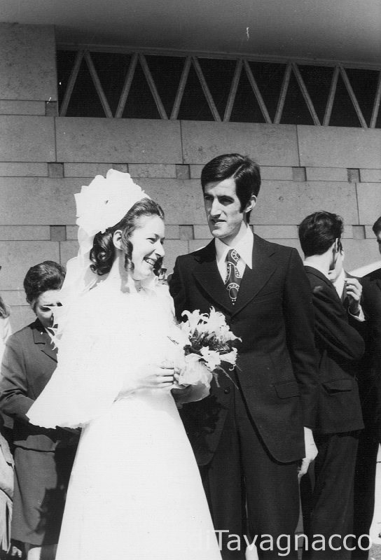 Gli sposi Fernanda Zenarolla e Francesco Basso ritratti il giorno del loro matrimonio sul sagrato della chiesa di S.Giuseppe, in mezzo ad altre persone.