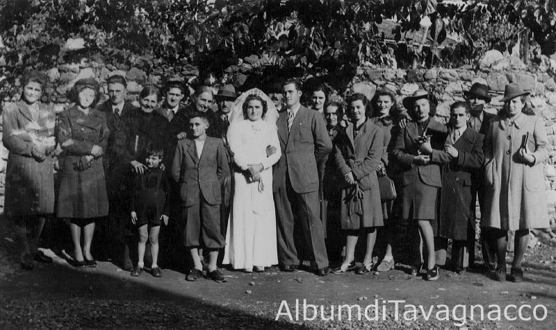 Matrimonio in Vicolo Clare. Gruppo nuziale in posa, con la sposa (Onelia Rodaro) e lo sposo al centro.