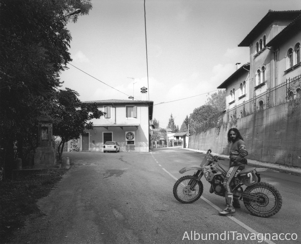 Motociclista con la moto, in posa in Via dell'Asilo. (davanti al vecchio asilo)