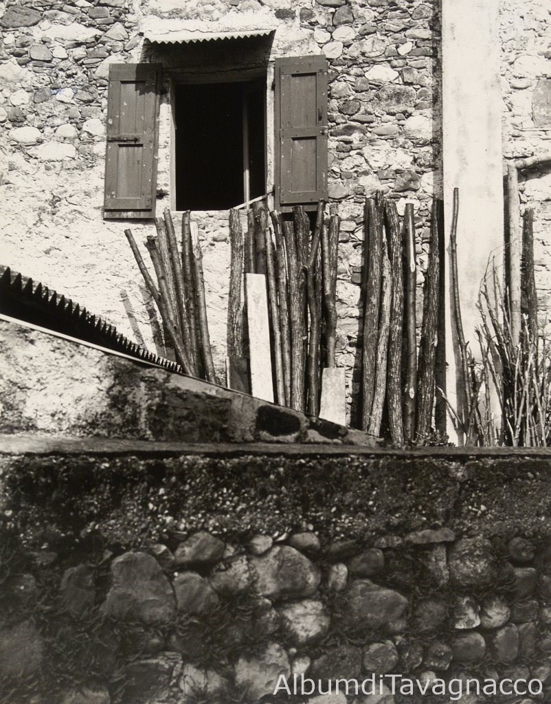 Bastoni appoggiati al muro, sotto la finestra di una antica casa in pietra, a Feletto.