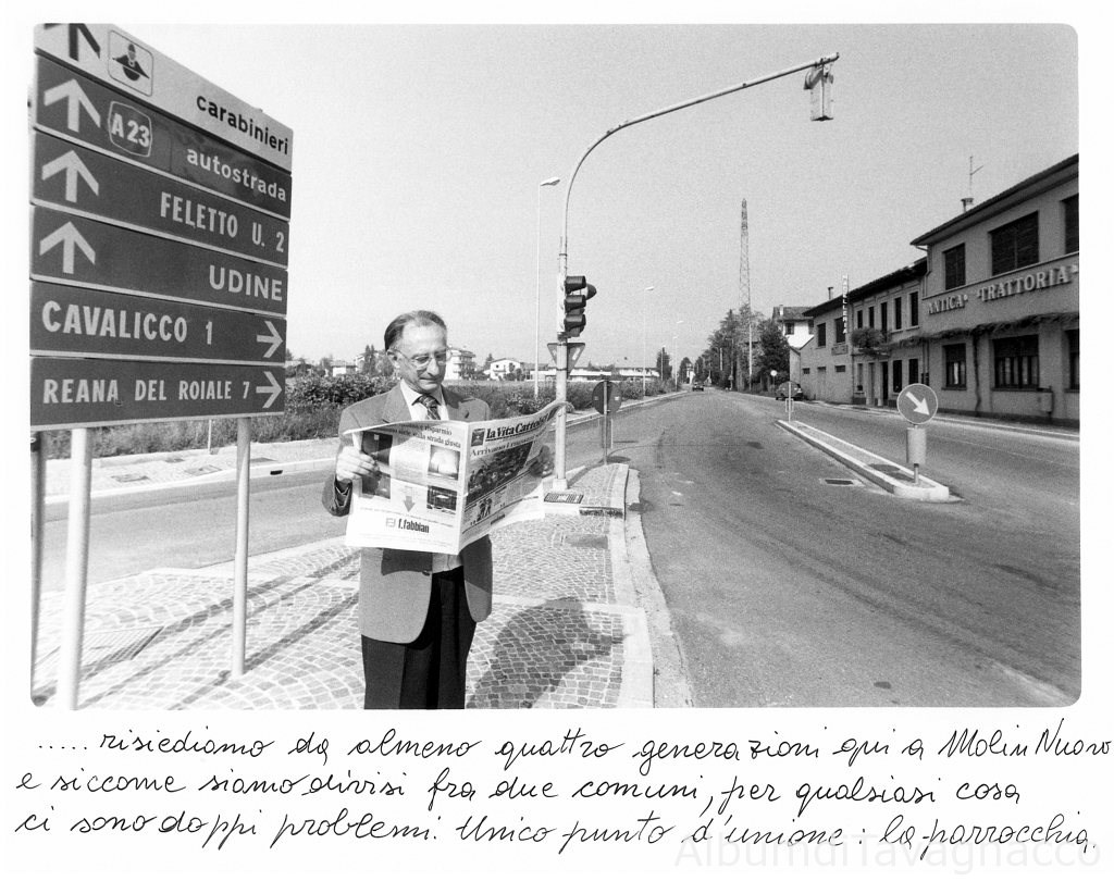 Uomo: Nino Rodaro. - Giornale. - Via Molin Nuovo. - Aiuola spartitraffico. - Semaforo. - Trattoria: Sguazzi. - Case. - Insegne