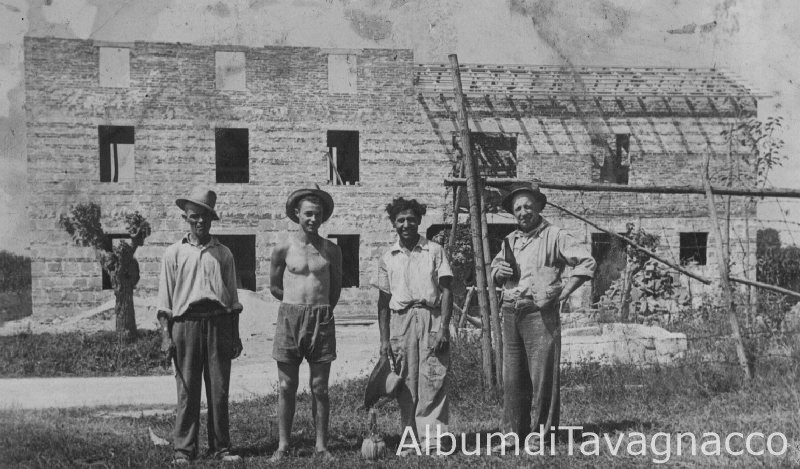 Gruppo di operai, in posa davanti a una casa in costruzione.