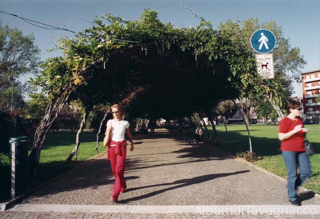 Parco pubblico: Parco Tinin. - Cartelli Stradali. - Piante: glicini. - Marciapiede