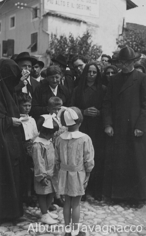 Gruppo di persone in strada (sacerdote, donne, uomini e bambini) in occasione della 1^ messa tenuta da Don Annibale.