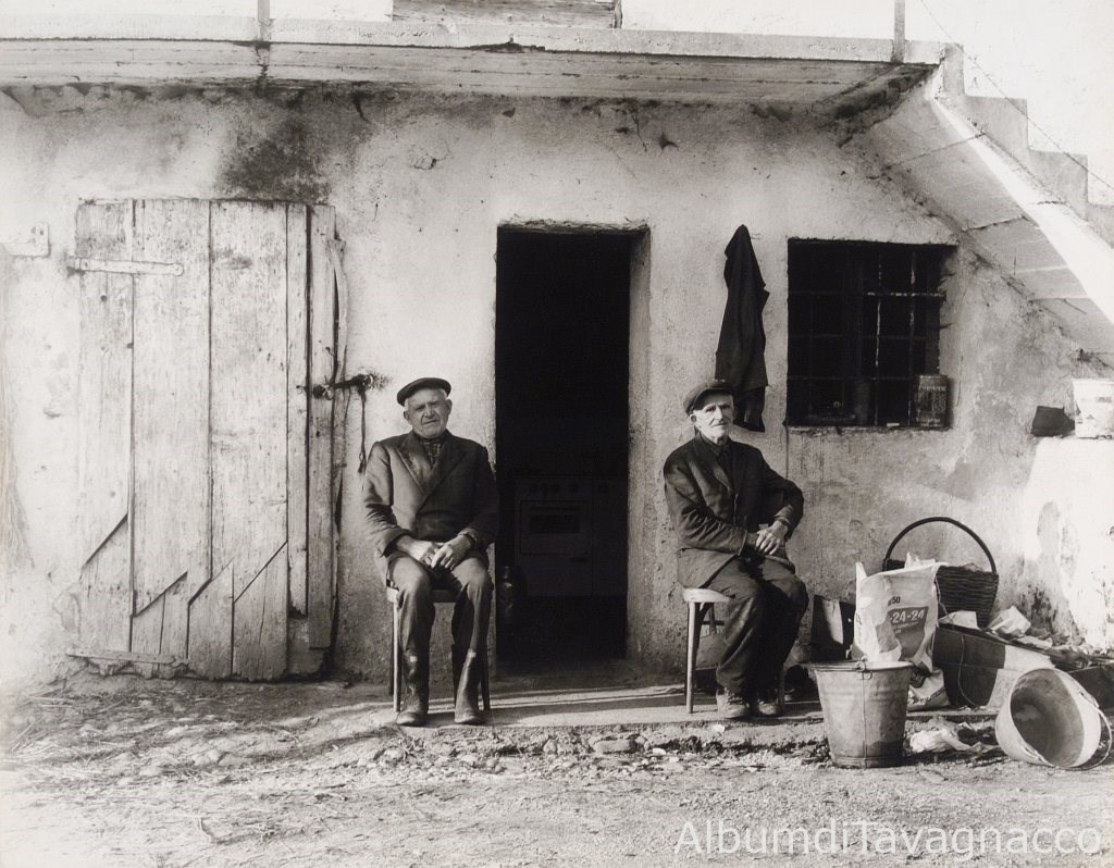 Due anziani, Pieri e Mario, seduti su due sedie, in posa sull’ingresso della loro abitazione.