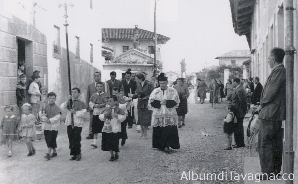 Corteo religioso che percorre Via Centrale in occasione della celebrazione della 1^ Comunione. In primo piano il parroco, Don Giuseppe Della Marina, e un gruppo di chierichetti.