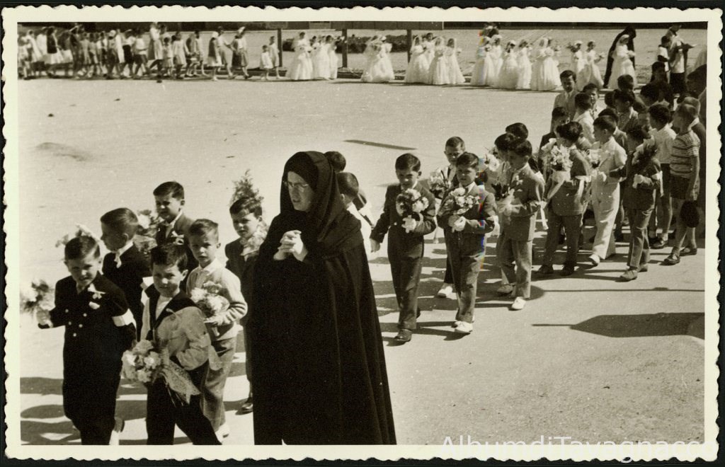 Corteo religioso di bambini ( coetanei, nati nel 1951) che sfilano in Piazza Libertà nel giorno della I^ Comunione, insieme a un sacerdote e a due suore.