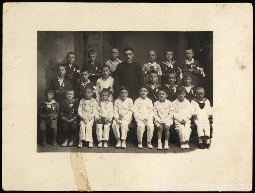 Gruppo di bambini, in posa insieme a un sacerdote, nella sagrestia della chiesa di Sant'Antonio Abate, nel giorno della I^ Comunione.