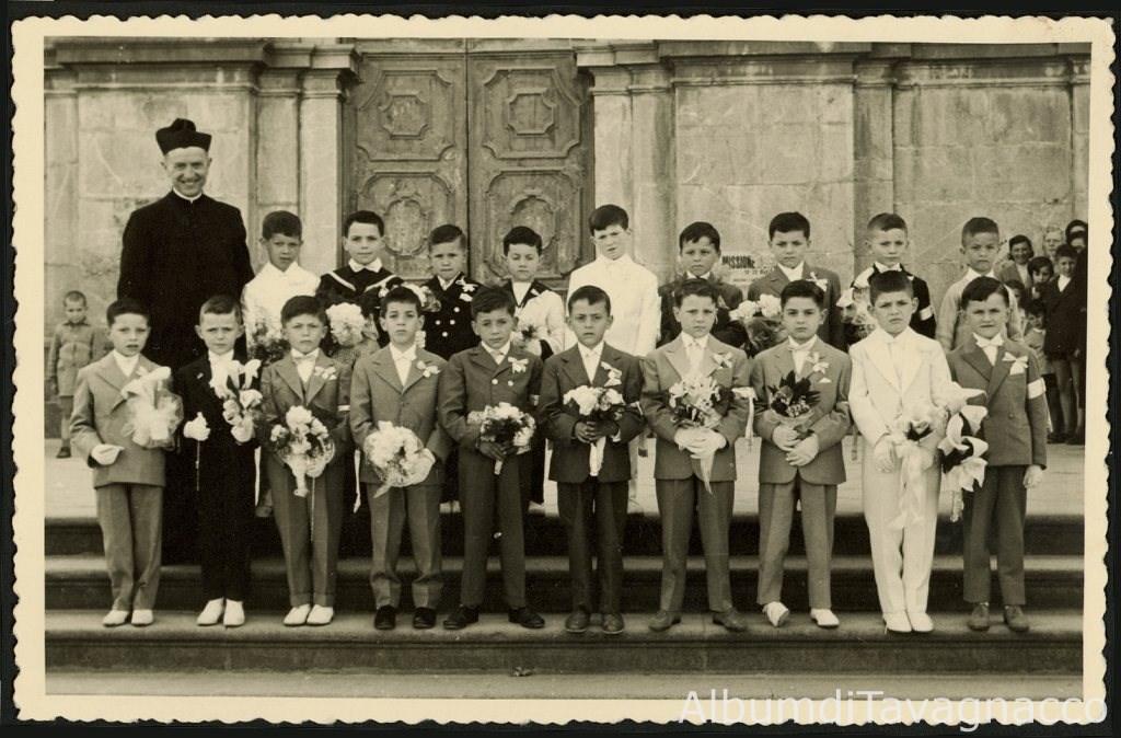Gruppo di bambini (coetanei, nati nel 1951) in posa, nel giorno della loro I^ Comunione, sul sagrato della chiesa di S. Antonio Abate insieme al parroco, Don Nicolò Rossi.