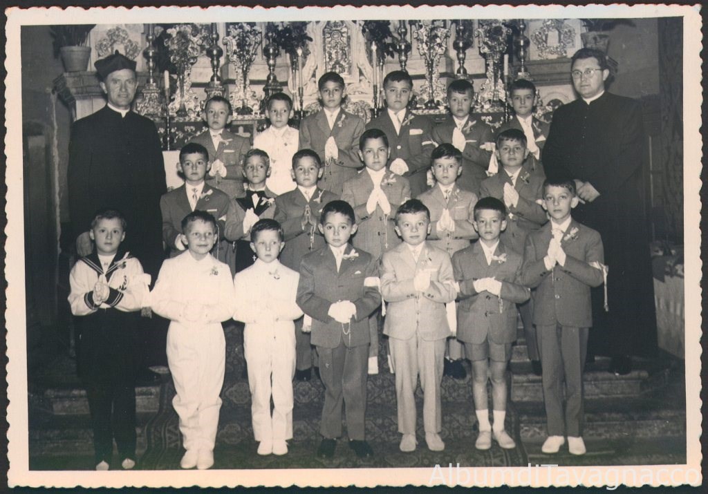 Gruppo di bambini, nati nel 1953 e nel 1954, in posa sull'altare della chiesa di S. Antonio Abate insieme al parroco Don Nicolò Rossi e a Don Pietro Bertoni, in occasione della I^ Comunione.