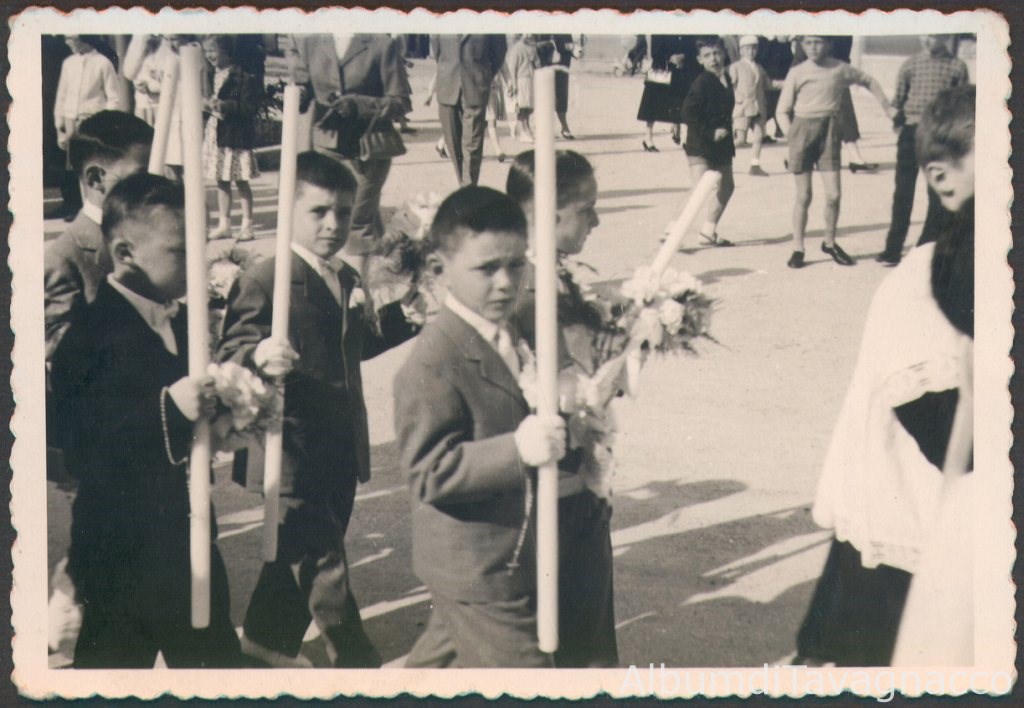 Silvano Pellarin, all'età di ca. 9 anni, insieme ad altri bambini che portano dei ceri, nel corteo religioso che sfila in Piazza Libertà, nel giorno della I^ Comunione.