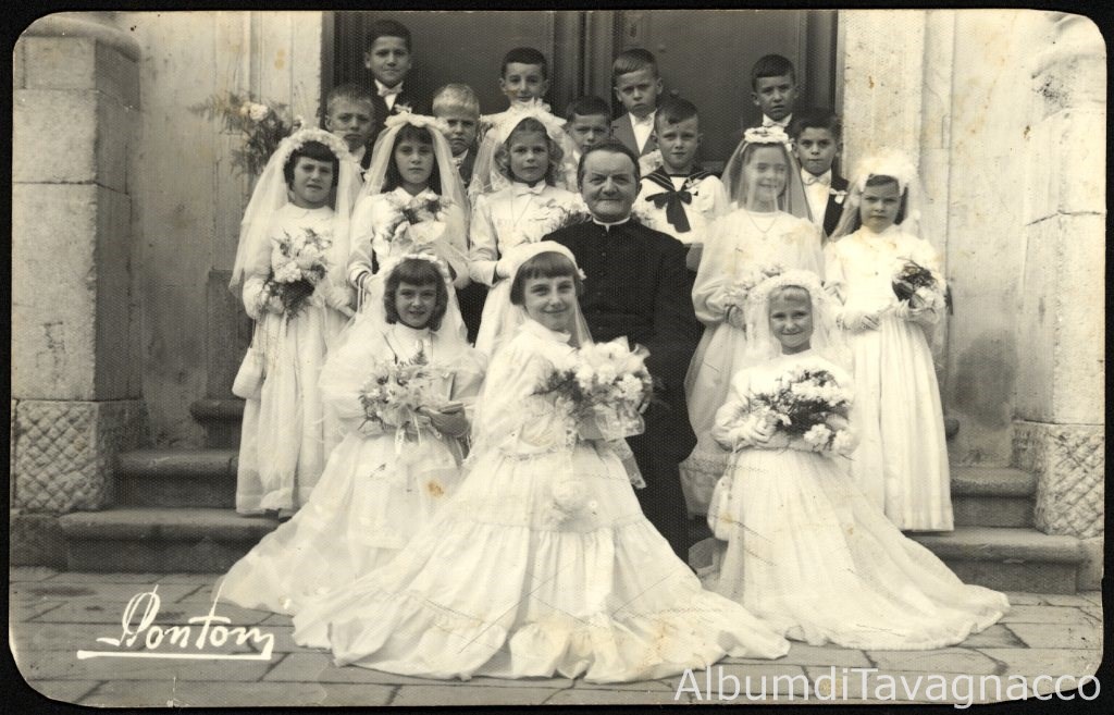 Gruppo di bambine e bambini, in posa insieme al parroco Don Monsutti, sul sagrato della chiesa di Sant'Antonio Abate, nel giorno della I^ Comunione.