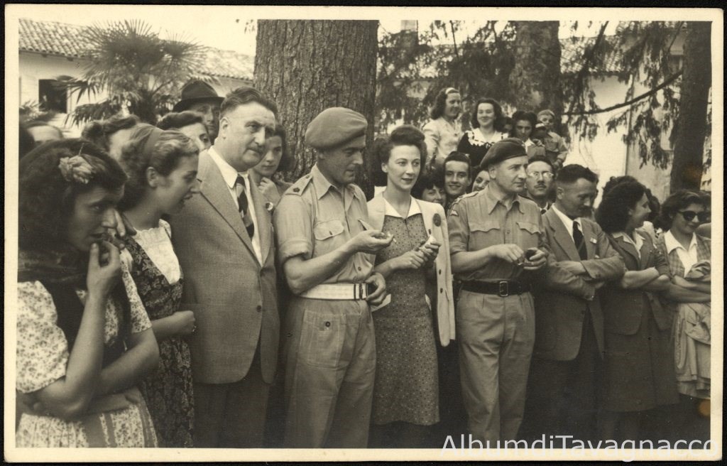 Il presidente della "Mostra degli asparagi", Zoilo Zanussi, insieme al comandante del reparto locale dell'esercito inglese alleato e ad altre persone, in posa all'esterno della trattoria "Al Parco", in occasione della I^ mostra dopo la liberazione.