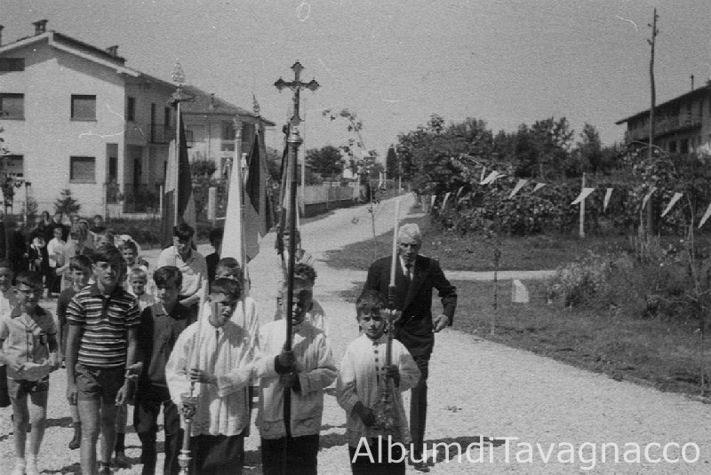 Piccolo corteo di una processione con Giuseppe Del Dò che accompagna un gruppo di chierichetti che portano il crocefisso e i ceri, e altri bambini che seguono con le bandiere.