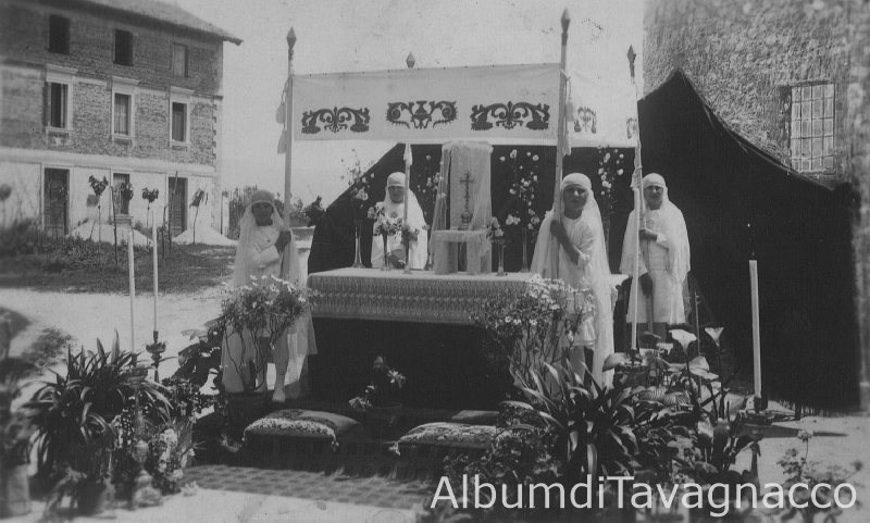 Gruppo di bambine, vestite con abiti da cerimonia religiosa, su un altare all'aperto, in occasione della processione del Corpus Domini.