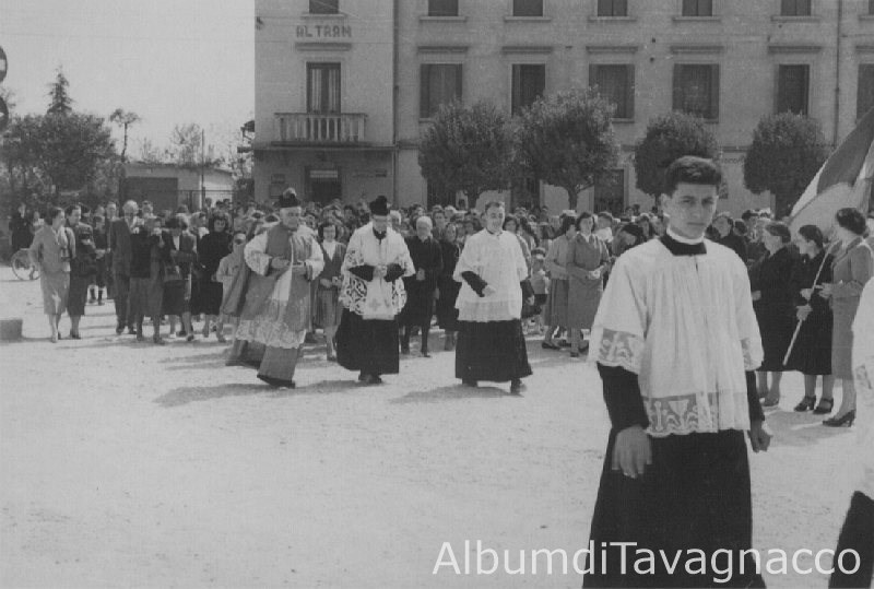 Processione in Piazza Di Prampero con il parroco e un sacerdote accompagnati da alcuni chierichetti, seguiti da un corteo di fedeli.
