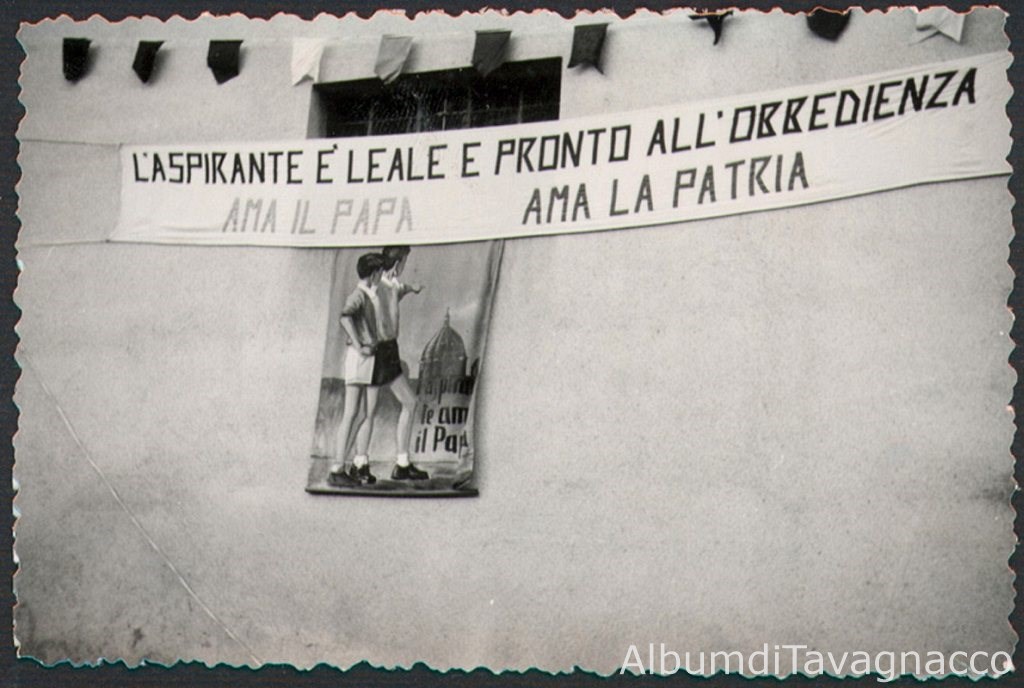 Festone, disegno e striscione con slogan di propaganda relativi all'Azione Cattolica, appesi su un muro del paese in occasione del congresso aspirantistico.