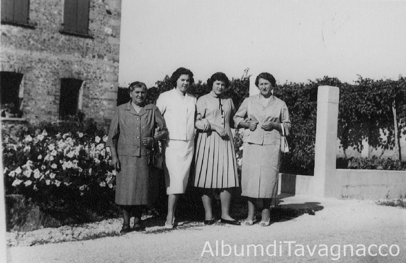Gruppo di quattro donne in posa sul ciglio della strada e nei pressi di un orto.