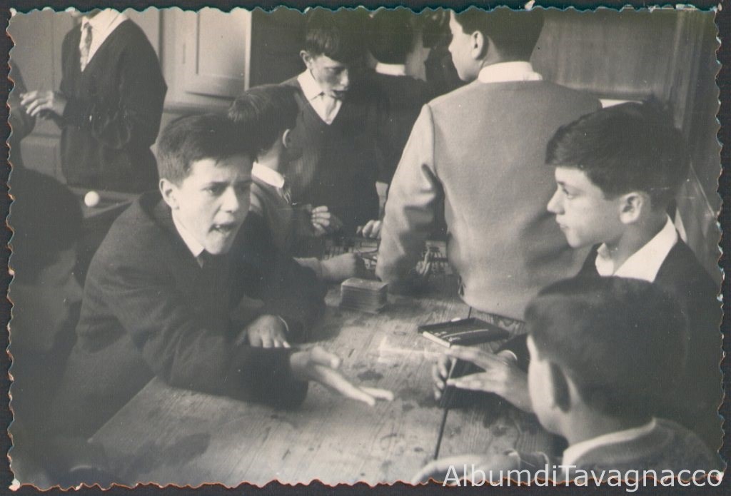 Gruppo di ragazzi che giocano a carte e con altri giochi da tavolo, dopo "messa grande", nella sede della GIAC (Villa Tinin).