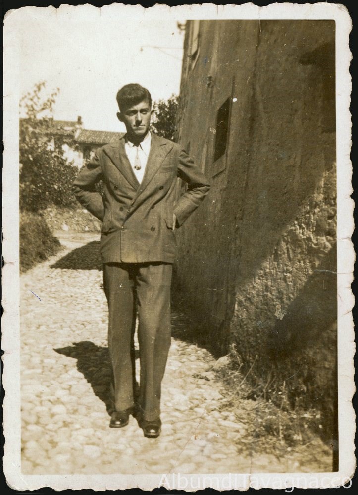 Ritratto a figura intera di un ragazzo dell'età apparente di ca. 15 anni, in posa in un vicolo del paese.