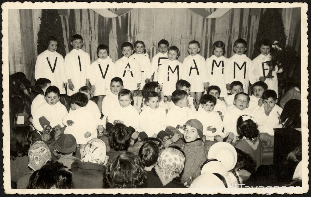 Bambini sul palcoscenico durante la recita in occasione della "festa della mamma", all'interno dell'asilo (Villa Tinin).