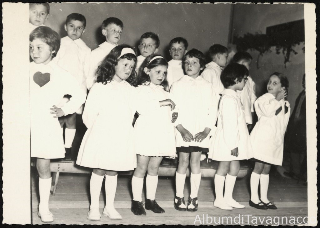 Gruppo di bambine e bambini dell'asilo (coetanei, nati nel 1960), sul palcoscenico della sala cinematografica di Feletto (Villa Tinin), per una recita in occasione della "festa della mamma".