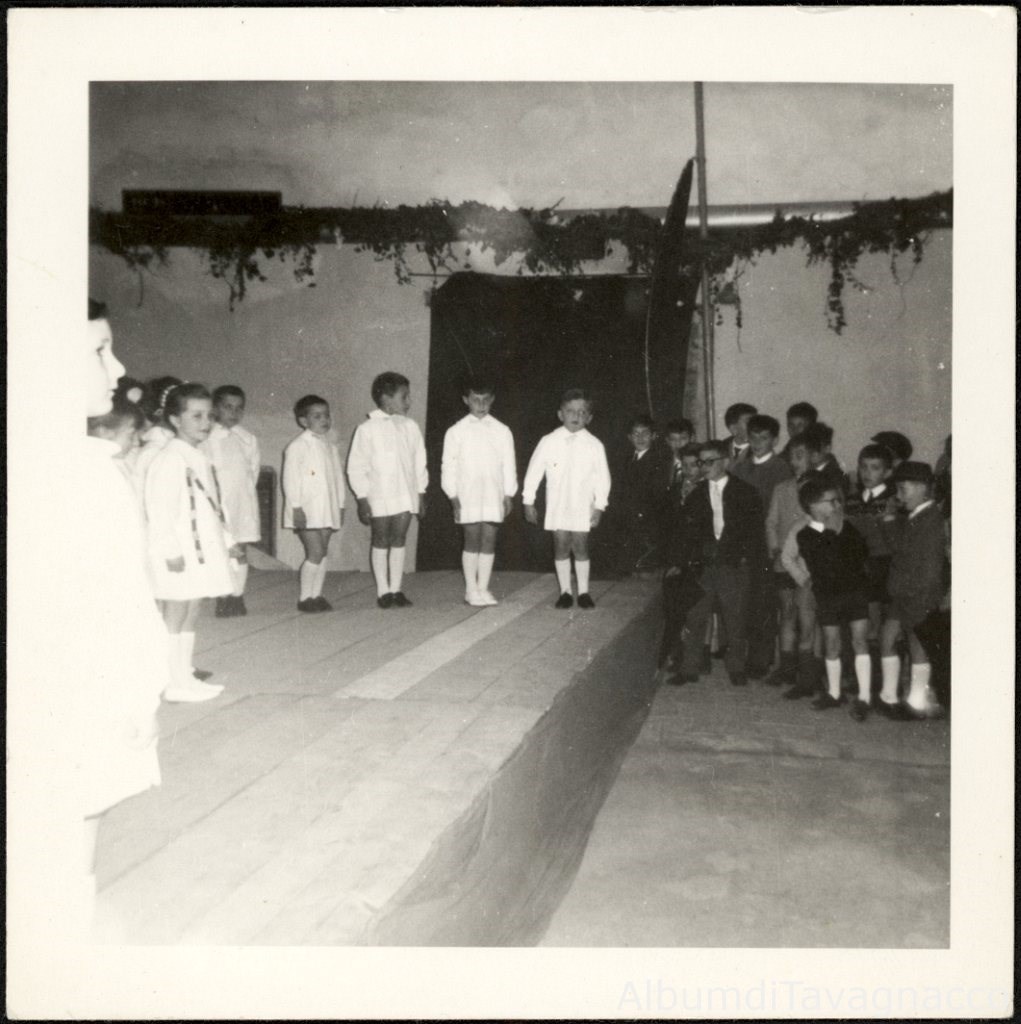 Bambini dell'asilo sul palcoscenico della sala cinematografica (Villa Tinin), durante la recita organizzata per la "festa della mamma".