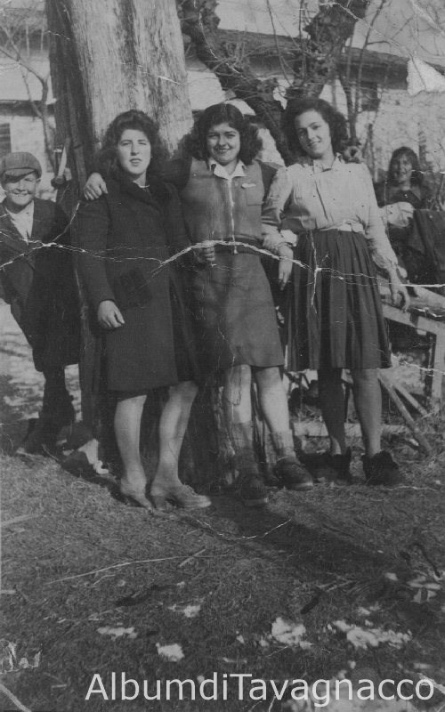 Ritratto di Bruna Piccini con la sorella e un gruppo di amiche, in posa nel cortile.
