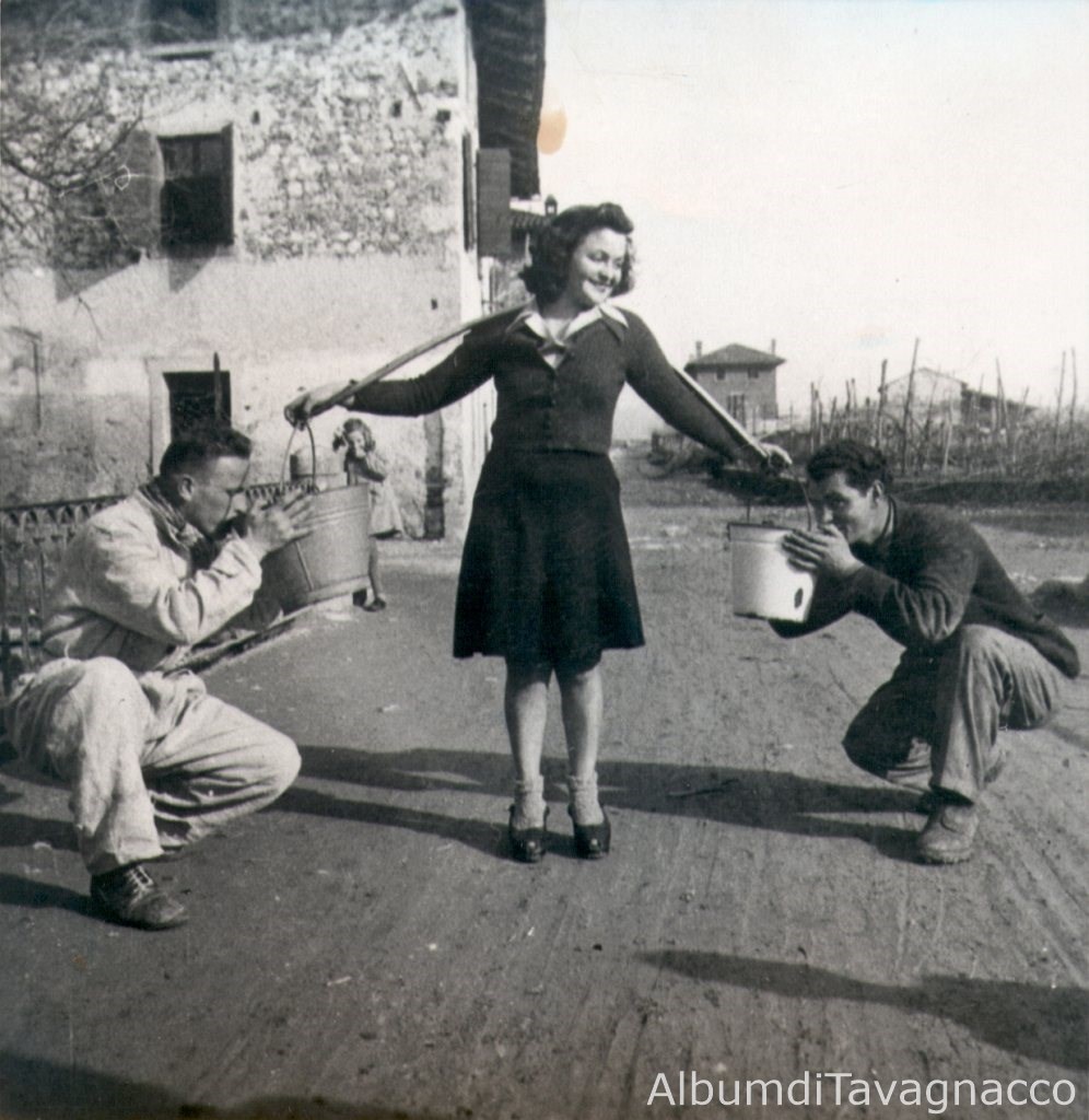 Scena tradizionale sul ponte di Via S.Bernardo: ritratto di una donna che porta due secchi con un bastone sulle spalle mentre due uomini, accosciati, bevono dai medesimi secchi.