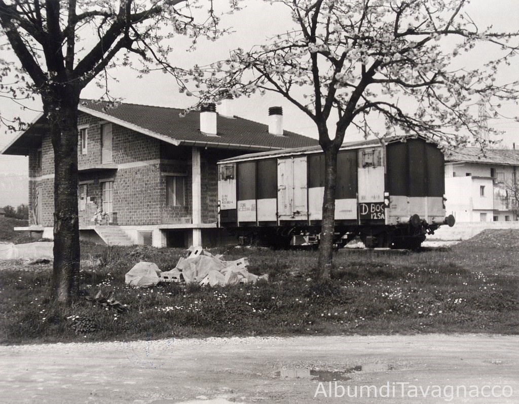 Un vagone ferroviaraio vicino a una casa in costruzione, ad Adegliacco.