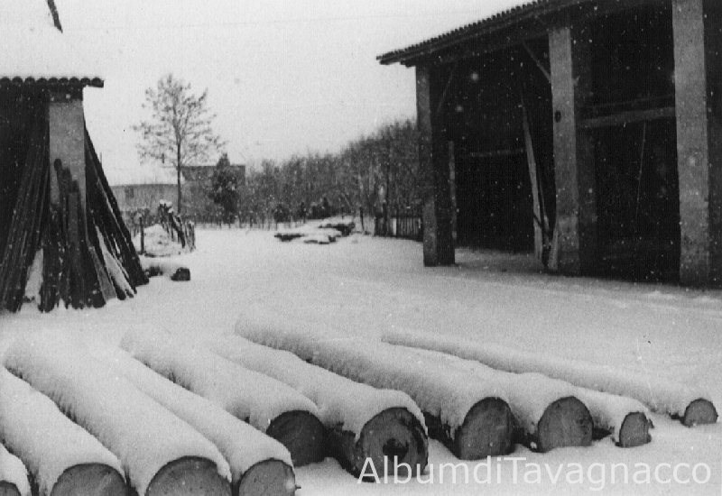 Il cortile della segheria Mazzilis ricoperto dalla neve.
