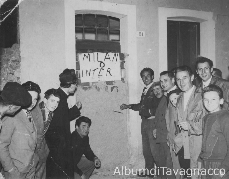 Gruppo maschile diviso in due sezioni, in posa all'esterno del bar "Al Cavallino", attorno a un cartello che riporta il risultato della sfida calcistica tra Milan e Inter.