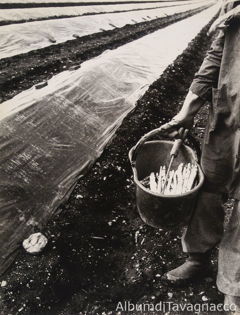Secchio di asparagi sostenuto da un agricoltore in una coltivazione di asparagiaie, a Tavagnacco.