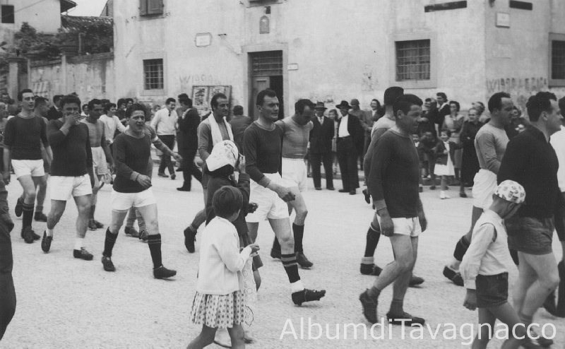 Le squadre di calcio dei celibi e degli ammogliati sfilano in Piazza Libertà, prima della partita.