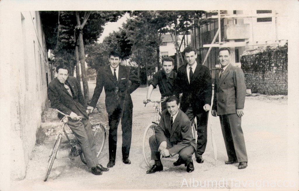 Gruppo di uomini in posa "sul cjanton", tradizionale luogo di incontro di tante generazioni di giovani e meno giovani, all'incrocio tra Via S.Bernardo e Via Centrale.