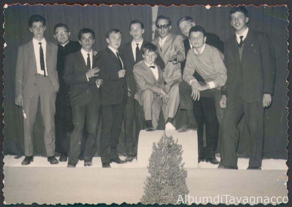 Teatro a Villa Tinin: la compagnia teatrale della commedia "Ci penso io", in posa sul palcoscenico insieme a Don Pietro Bertoni (attività GIAC).