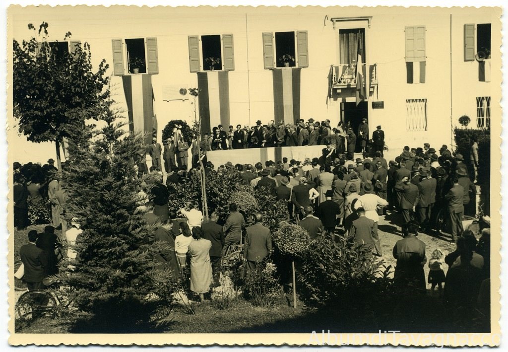 Terzo anniversario della morte del geologo Egidio Feruglio. Il palco delle personalità in Piazza Santa Caterina, di fronte a casa Feruglio, durante il discorso del prof. Ardito Desio.