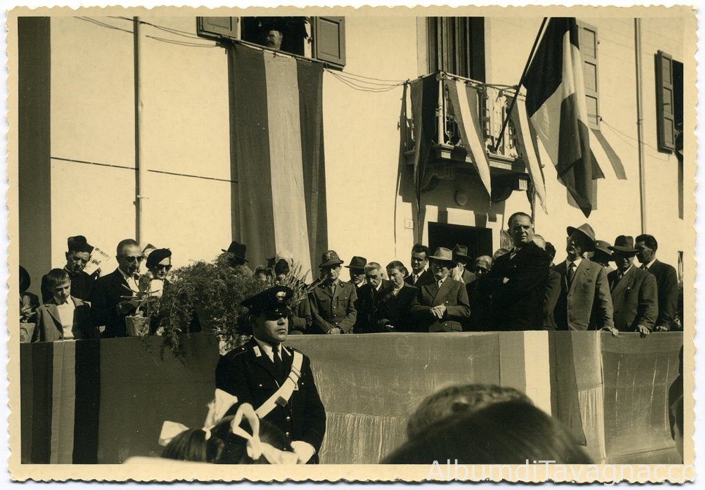 Terzo anniversario della morte del geologo Egidio Feruglio. Il palco delle personalità in Piazza Santa Caterina, di fronte a casa Feruglio, durante il discorso del prof. Ardito Desio.